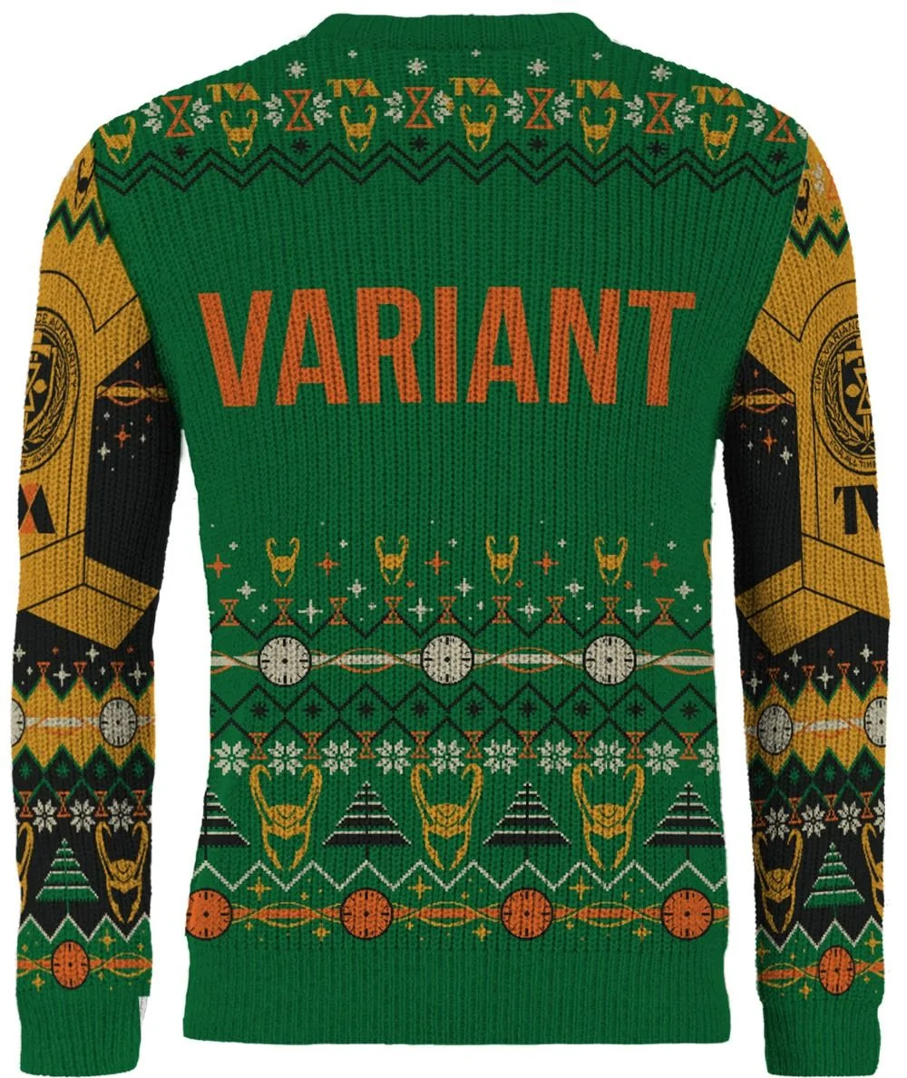 The Christmas Variant takes the typical ugly Christmas sweater and throws in a Marvel twist. The design reflects the vibrant chaos and excitement of the multiverse, with holiday motifs mixed in for the perfect festive touch. A must-have for anyone who loves a superhero-filled Christmas with a dash of interdimensional adventure!