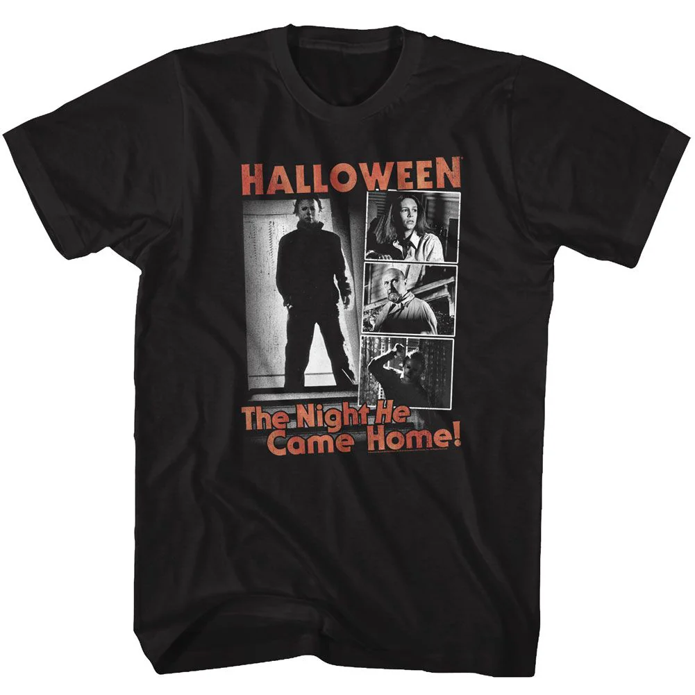 Featuring a bold front graphic of Michael Myers with the legendary tagline “The Night He Came Home,” this design is a must-have for anyone who reveres the original Halloween film.
