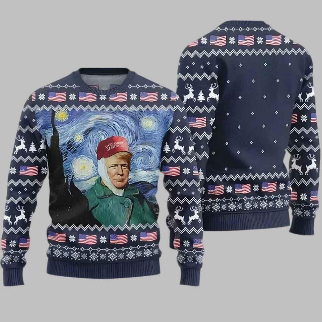 The The Starry Night Donald Trump Ugly Christmas Sweater features a bold and unique design that merges art, humor, and holiday spirit. The front showcases a reimagined version of Van Gogh?s famous The Starry Night, with Donald Trump proudly at the center, wearing a “Make America Great Again” hat and a festive coat. Surrounding the artistic centerpiece are patriotic symbols, including American flags, snowflakes, and reindeer, all in a classic ugly sweater style.