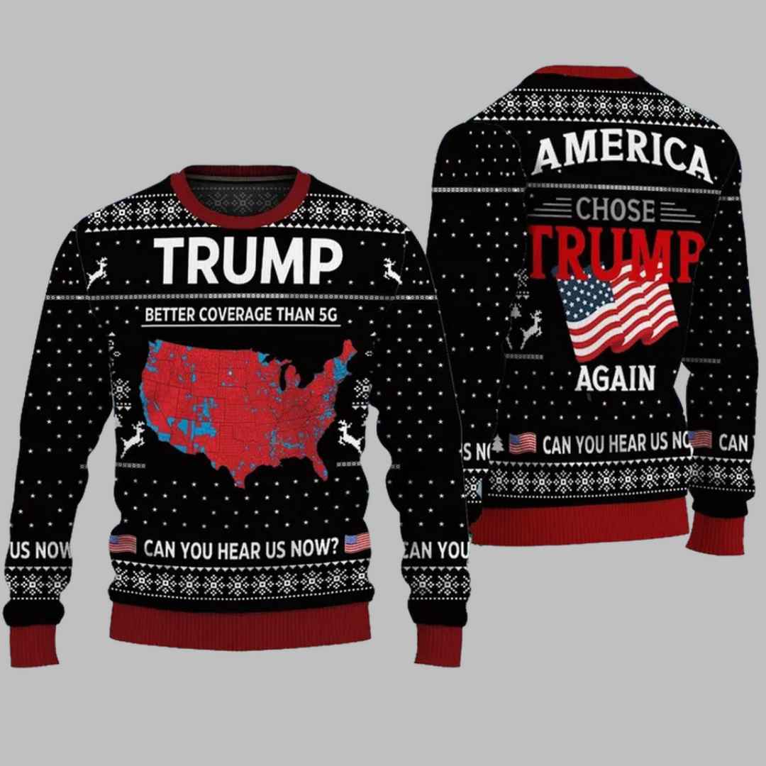 The Trump Can You Hear Us Now Make America Great Again Ugly Christmas Sweater features a striking design that blends festive elements with political flair. The front displays a vibrant map of America in red and blue with the humorous tagline ?Better Coverage Than 5G? in bold lettering. Snowflake patterns, reindeer, and patriotic American flags decorate the sweater, adding a touch of holiday charm.