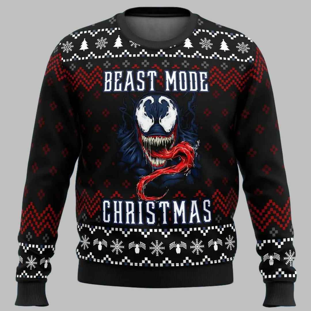 This striking sweater features Venom in all his terrifying glory, with the words “Beast Mode Christmas” boldly displayed. The design captures the symbiote’s menacing grin, sharp teeth, and long tongue, all set against a backdrop of festive snowflakes and intricate patterns. Made from quality materials, this sweater is not only comfortable to wear but also durable enough to withstand any holiday mayhem.