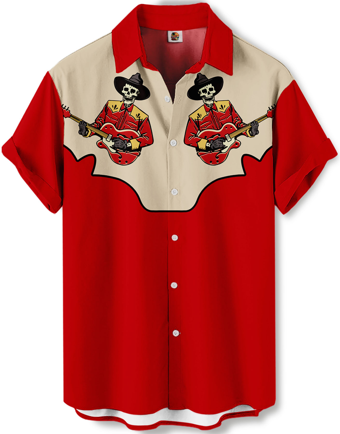 Unisex Western Skeleton Cowboy Button Down Shirt, Short Sleeve, Red and Beige, Guitar Player Design