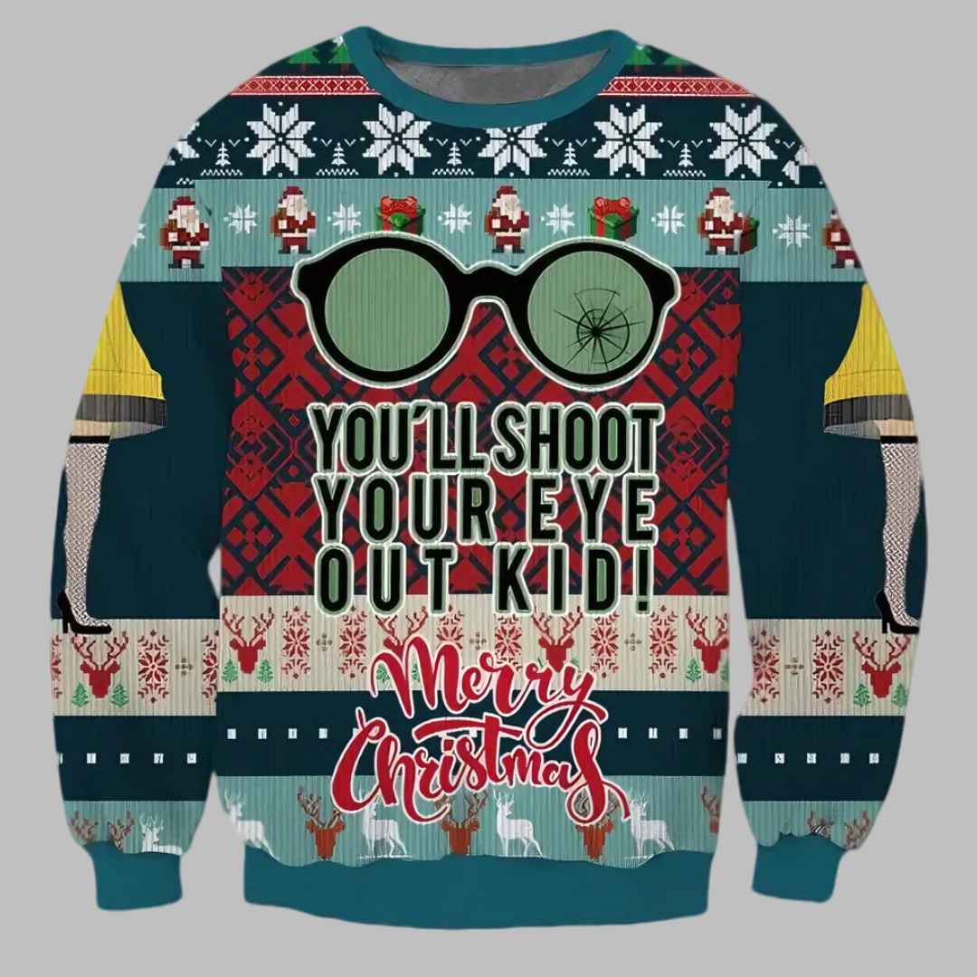 “You’ll shoot your eye out, kid!” Relive the hilarious holiday classic, “A Christmas Story,” with this You Will Shoot Your Eye Out Kid Ugly Christmas Sweater! This festive and funny sweater is a must-have for any fan of the movie and a guaranteed way to spread Christmas cheer with a touch of nostalgic humor.
