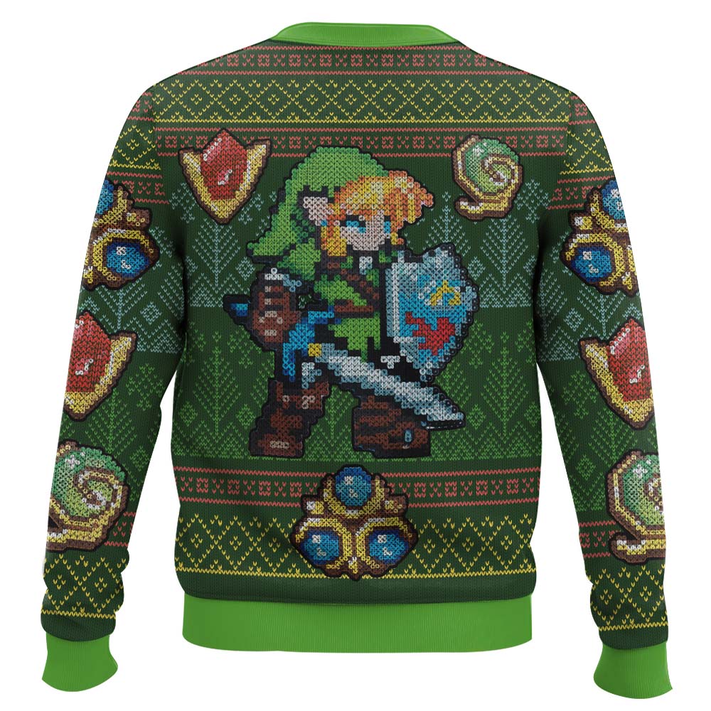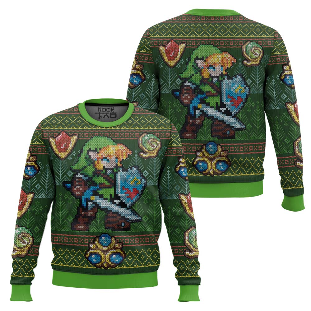 Zelda Link Green Ugly Christmas Sweater This Curvy Glams exclusive Ugly Christmas Sweater design is guaranteed to get attention and get the party started. It?s sure to be your best holiday purchase yet! Material: Our sweaters are made from high-quality polyester wool blend, which keeps you warm and never crack, peel or flake. Features a specialty high definition heat-dye application that ensures long lasting color vibrancy even after machine washing. All our sweaters are handcrafted, cut and sewn one-by-one for the highest quality standard Sizing: Unisex fit. Click on size chart button above add to cart button for addiditional sizing information Care Instructions: Regular handwash; Machine wash (max 40? or 105F); Do not bleach; Iron on a low heat;Tumble dry.